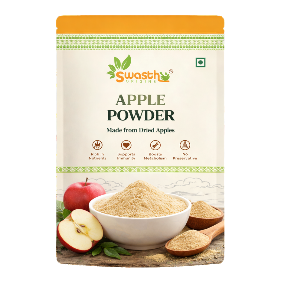 Swasth Origins Apple Powder is produced from premium-quality apples that are hygienically washed, sliced, and dehydrated using controlled drying techniques to retain their natural taste and nutritional value. The dried apples are finely ground to ensure a smooth texture and consistent quality in every batch.Naturally rich in fiber and antioxidants, Apple Powder supports digestive wellness and adds natural sweetness to a variety of food and beverage preparations. It is widely used in smoothies, baby food, bakery products, sauces, health drinks, confectionery, and nutraceutical formulations.Our clean-label manufacturing process ensures 100% pure apple powder with no preservatives, artificial colors, fillers, or additives. Each batch is processed under strict hygienic standards and quality-tested for safety and consistency—making it suitable for daily use as well as bulk and wholesale supply.
