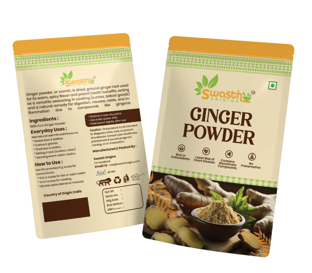 Swasth Origins Ginger Powder is produced from premium-quality ginger roots that are hygienically washed, sliced, and dehydrated using advanced drying techniques to retain their natural oils and active compounds. The powder is finely milled to ensure smooth texture, strong flavor, and consistent quality in every batch.Naturally rich in antioxidants and anti-inflammatory properties, Ginger Powder is known to support digestive health, relieve occasional discomfort, boost immunity, and promote overall vitality. It is widely used in herbal drinks, traditional remedies, cooking, baking, and functional food formulations.Our clean-label manufacturing process ensures 100% pure ginger with no preservatives, artificial colors, additives, or fillers. Manufactured under hygienic conditions and tested for quality, Swasth Origins Ginger Powder is suitable for individual wellness consumption as well as bulk and wholesale supply needs.
